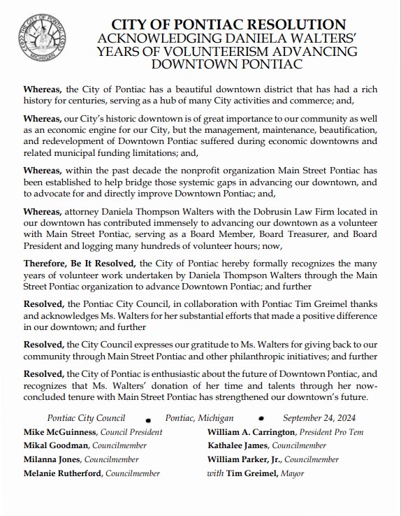 Dobrusin IP Law is proud to announce that Daniela Walters has been formally recognized by the City of Pontiac for her volunteer service in the city, including with the Main Street Pontiac organization. A Resolution passed by the Pontiac City Council, with the endorsement of Mayor Tim Greimel, highlights Daniela’s impactful contributions in improving Downtown Pontiac.